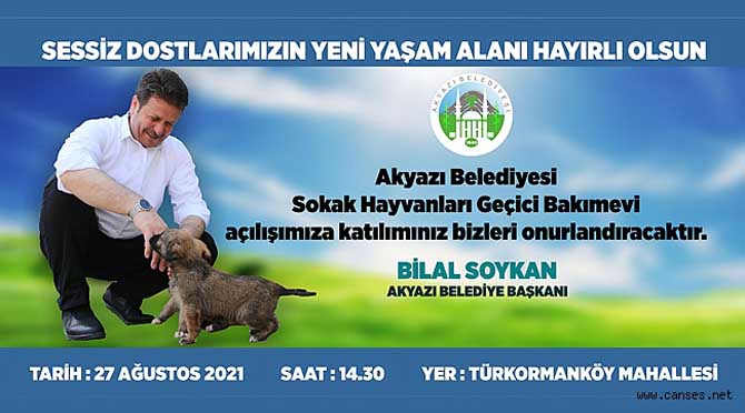 Akyazı Belediyesi Sokak Hayvanları Geçici Bakımevi açılışımız 27 Ağustos 2021 Cuma Günü Saat:14.30’da Türkormanköy Mahallesinde açılışı gerçekleşecektir. Bilal SOYKAN Akyazı Belediye Başkanı