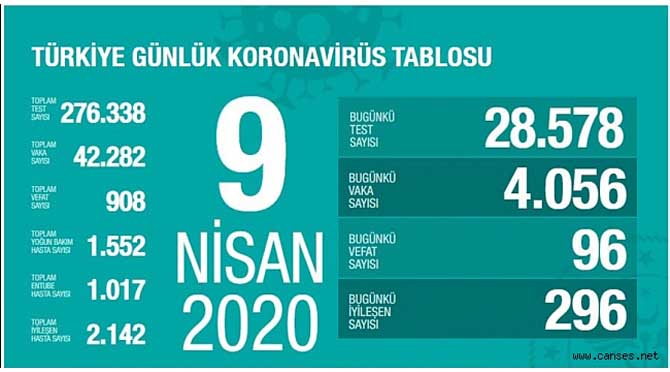 Sağlık Bakanı Fahrettin Koca, bugün virüs nedeniyle 96 kişinin hayatını kaybettiğini söyledi. Bugünkü vaka sayısı da 4 bin 56 oldu. Böylece Türkiye'deki toplam vaka sayısı 42 bin 282, toplam ölüm sayısı ise 908 oldu.