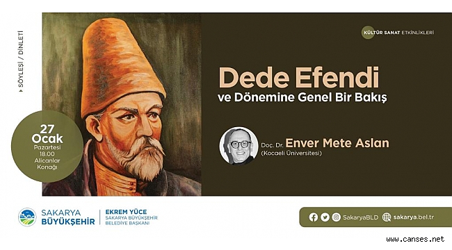 Sakarya Büyükşehir Belediyesi Kültür ve Sosyal İşler Dairesi Başkanlığı tarafından düzenlenen Ocak Kültür Sanat Etkinlikleri ‘Dede Efendi ve Dönemine Genel Bir Bakış’ konulu söyleşi ve dinleti programı ile devam edecek. 27 Ocak Pazartesi günü Alicanlar Konağı’nda gerçekleştirilecek olan programa Doç. Dr. Enver Mete Aslan konuşmacı olarak katılacak. Saat 18.00’da başlayacak program ile ilgili Kültür ve Sosyal İşler Dairesi Başkanlığı’nca yapılan açıklamada, ‘Dede Efendi ve Dönemine Genel Bir Bakış’ konulu söyleşi ve dinleti programına tüm kültür sanat dostları davetlidir” denildi.