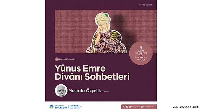 Sakarya Büyükşehir Belediyesi Kültür Sanat Etkinlikleri 8 Şubat Cumartesi günü gerçekleştirilecek olan ‘Konak Sohbetleri’ programı ile devam edecek. Tarihi Alicanlar Konağı’nda saat 15.00’da gerçekleşecek olan ‘Yunus Emre Divanı’ sohbetine Yazar Mustafa Özçelik konuşmacı olarak katılacak. Sonrasında ise saat 18.00’da Prof. Dr. Necdet Tosun’un konuşmacı olarak katılacağı ‘Hüdayı Divanı’ sohbeti kültür sanat dostları ile buluşacak.