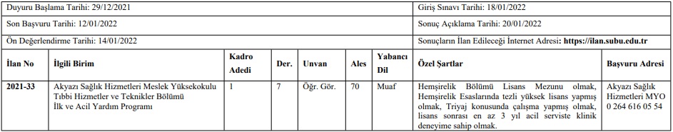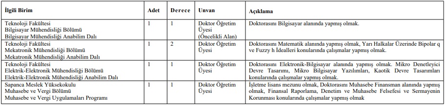 Sakarya Uygulamalı Bilimler Üniversitesi (SUBÜ); Teknoloji Fakültesi, Akyazı Sağlık Hizmetleri Meslek Yüksekokulu ve Sapanca Meslek Yüksekokulu’nda görev yapmak üzere akademik personel alım ilanına çıktı. İlanla; 4 doktor öğretim üyesi ve 1 öğretim görevlisi alınacak. İlanda Teknoloji Fakültesi Bilgisayar Mühendisliği Bölümü’ne alınacak 1 doktor öğretim üyesi kadrosu öncelikli alan olarak belirtildi. Doktor öğretim üyesi kadroları için ilanın Resmi Gazete’de yayımlandığı tarihten itibaren 15 gün içerisinde başvuru yapılabilecek. Öğretim görevlisi kadrosu içinse 12 Ocak 2022 Çarşamba gününe kadar başvurular alınarak 18 Ocak 2022 Salı günü ön değerlendirmeyi geçen adaylar arasında giriş sınavı gerçekleştirilecek. Başvuru süreci ve sonuçlar https://ilan.subu.edu.tr adresinden takip edilebilecek.