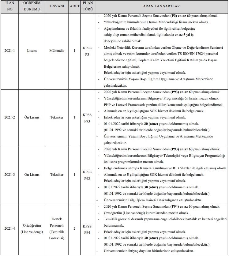 Sakarya Uygulamalı Bilimler Üniversitesi (SUBÜ), 2020 yılı Kamu Personeli Seçme Sınavı (KPSS) ile sözleşmeli personel alımı için ilana çıktı. Resmi Gazete’de yayımlanan ilanla 1 adet lisans mezunu mühendis, 2 adet ön lisans mezunu tekniker ve 2 adet ortaöğretim (lise ve dengi) mezunu destek personeli olmak üzere toplam 5 personel alınacak. İlanlara başvurular 28 Aralık 2021 Salı başlayacak ve 11 Ocak 2022 Salı günü mesai bitiminde sona erecek. 17 Ocak 2022 Pazartesi günü duyurulacak sonuçlarla birlikte tüm detaylar personel.subu.edu.tr adresinden takip edilebilecek.