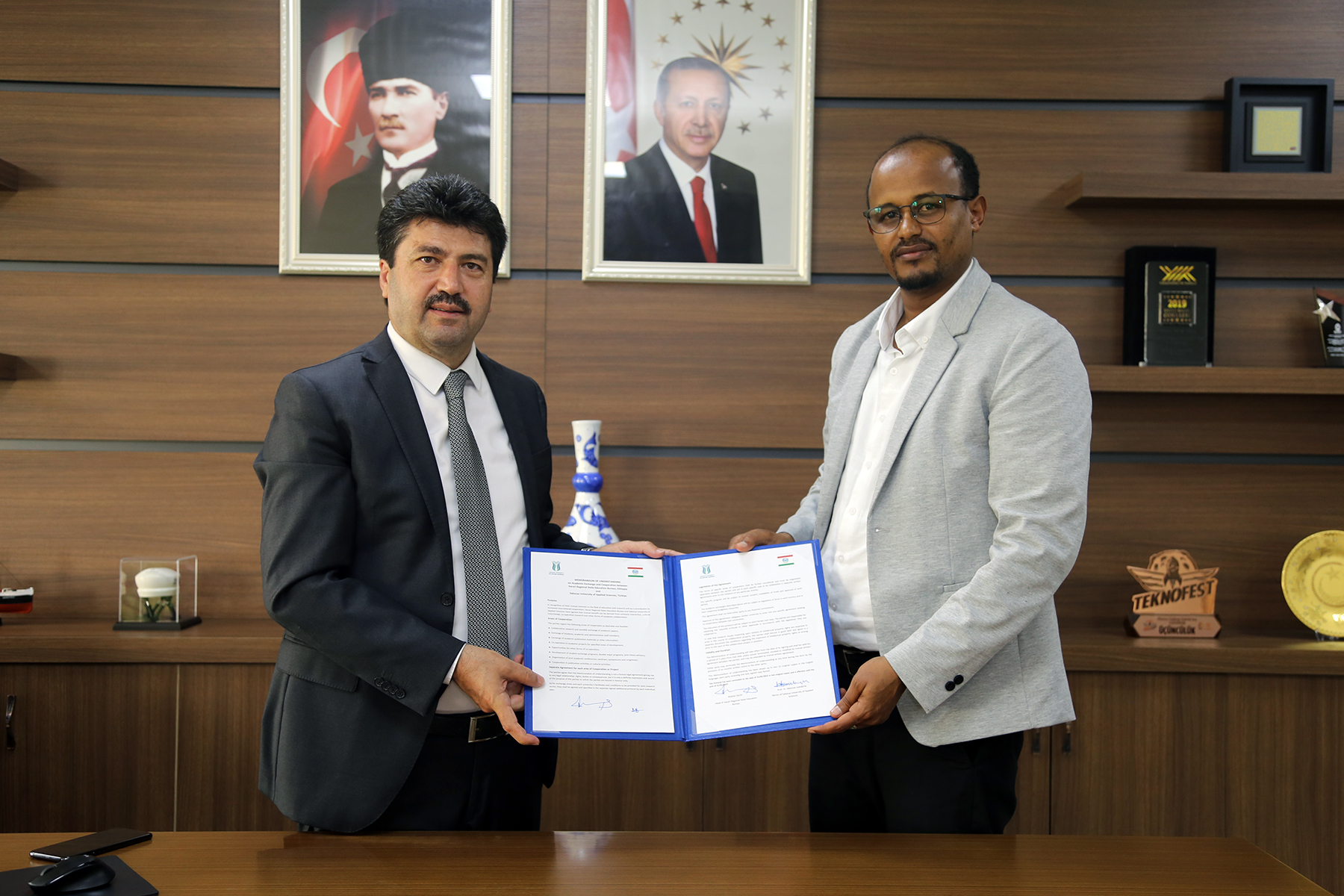 Sakarya Uygulamalı Bilimler Üniversitesi (SUBÜ) ve Etiyopya Harar Bölgesel Devlet Eğitim Bürosu arasında iş birliği protokolü imzalandı. SUBÜ Rektörü Prof. Dr. Mehmet Sarıbıyık ve Harar Bölgesel Devlet Eğitim Bürosu Başkanı Muktar Salih tarafından imzaların atıldığını protokol töreninde SUBÜ Rektör Yardımcısı Prof. Dr. Sinan Serdar Özkan, Karasu Meslek Yüksekokulu Müdürü Doç. Dr. Sedat Durmuşkaya ve Harar Bölge Devlet Denetçisi Genel Büro Başkanı Dr. Abdullahi Ahmed Wazir yer aldı. Protokolle; Etiyopya’daki öğretmenlerin Türkiye’de eğitimi, çevrimiçi kurslar, karşılıklı ziyaretler, lisans ve lisansüstü öğrenci çalışmaları ile öğrenci değişimi, ortak proje ve yayınlar, bilgi ve tecrübe paylaşımı ile ortak konferans ve akademik programları içeren alanlarda iş birliği gerçekleştirilecek.