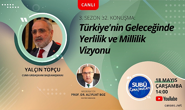 Sakarya Uygulamalı Bilimler Üniversitesi (SUBÜ) tarafından düzenlenen SUBÜ Konuşmaları’nın 32’inci konuşmacısı, ‘Türkiye’nin Geleceğinde Yerlilik ve Millilik Vizyonu’ başlıklı söyleşiyle Cumhurbaşkanı Başdanışmanı Yalçın Topçu olacak. Moderatörlüğünü SUBÜ Rektör Yardımcısı Prof. Dr. Ali Fuat Boz’un üstleneceği söyleşide; millilik bilincine sahip olmanın önemi, çeşitli alanlarda millileşme hamleleri ile bunların önemi ve geleceğe yönelik katkıları üzerinde durulacak. 18 Mayıs Çarşamba günü saat 14.00’te gerçekleştirilecek söyleşi, üniversitenin YouTube kanalı SUBÜ Haber’den canlı yayınlanacak.
