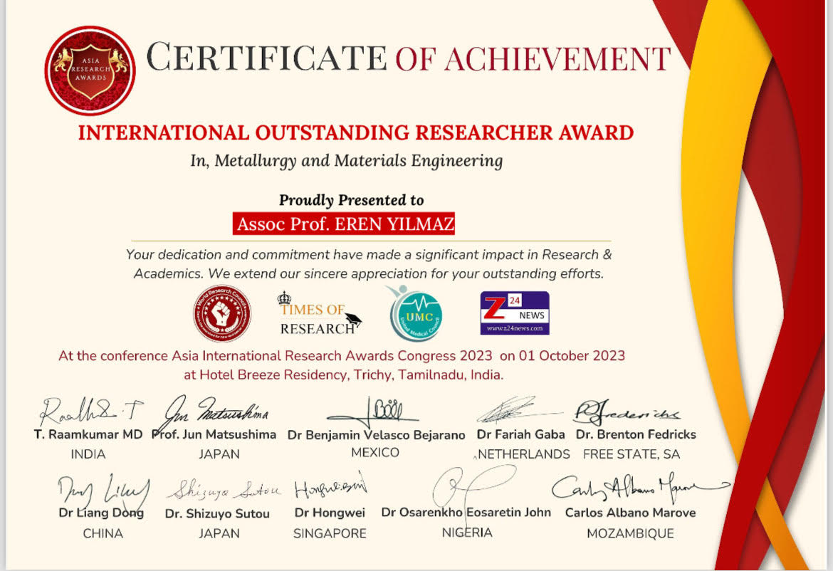 Sakarya Uygulamalı Bilimler Üniversitesi (SUBÜ) Teknoloji Fakültesi Metalurji ve Malzeme Mühendisliği Bölümü öğretim üyeleri Prof. Dr. Fatih Çalışkan ve Doç. Dr. Eren Yılmaz uluslararası ödülün sahibi oldular. Çalışkan ve Yılmaz, Materials Chemistry and Physics Dergisi’nde yayınladıkları diş implantlarının tasarımı ve geliştirilmesi ile ilgili ‘A New Functional Graded Dental Implant Design with Biocompatible and Antibacterial Properties’ isimli makale ile Hindistan’da düzenlenen Asya Uluslararası Araştırma Ödülleri 2023 kapsamında Asya Seçkin Araştırmacı Ödülü’ne (Asia’s Outstanding Researcher) layık görüldüler. Ödül, sorumlu yazar Doç. Dr. Eren Yılmaz’a takdim edildi.