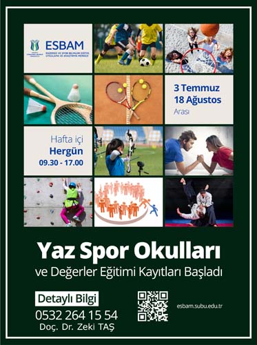 Sakarya Uygulamalı Bilimler Üniversitesi (SUBÜ) Egzersiz ve Spor Bilimleri Eğitim Uygulama ve Araştırma Merkezi (ESBAM) tarafından çocuk ve gençlerin fiziksel, zihinsel, sosyal ve psikolojik gelişimlerine katkı sağlamak amacıyla organize edilen yaz spor okulları başlıyor. 3 Temmuz 2023 ve 18 Ağustos 2023 tarihleri arasında 6 hafta süreyle 09.30-17.00 saatleri arasında düzenlenecek yaz spor okullarında futbol, basketbol, badminton, tenis, geleneksel okçuluk ve karate branşları yer alacak. Katılımcı öğrencilere seçtikleri iki farklı branşta spor eğitim hizmeti verilecek. ESBAM yaz spor okulları kapsamında spor eğitiminin yanı sıra talep edenlere Serdivan Kampüs Cami’nde Kuran-ı Kerim, Din Eğitimi ve ezber derslerini içeren değerler eğitimi de herhangi bir ücret talep edilmeden verilecek. 6-14 yaş aralığında çocuk ve gençlerin kayıt edilebileceği yaz spor okulları için kayıtlar https://esbam.subu.edu.tr/tr adresindeki online form ile yapılacak. Buna ek olarak velilerden matbu başvuru formunu doldurarak ESBAM’a teslim etmeleri istenecek. 0532 264 15 54 numaralı telefondan detaylı bilgi alınabilecek.