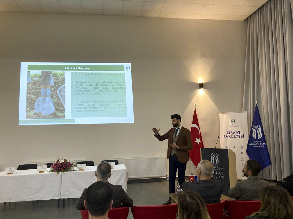 Sakarya Uygulamalı Bilimler Üniversitesi (SUBÜ) Ziraat Fakültesi’nde Tarımsal Öğretimin 177. Yıl Dönümü Etkinlikleri kapsamında ‘Turunçgil Uzun Antenli Böceği Paneli’ düzenlendi. SUBÜ Rektörü Prof. Dr. Mehmet Sarıbıyık, Rektör Yardımcısı Prof. Dr. Sinan Serdar Özkan, Ziraat Fakültesi Dekanı Prof. Dr. Taki Demir, akademisyenler ve ilgili kamu kurumlarında çalışan bürokratların katıldığı panelde turunçgil uzun antenli böceğinin zararları, nasıl mücadele edilebileceği ve zararlıya ilişkin Türkiye’de yapılan çalışmalar konuşuldu. Panelin sonunda dinleyicilerden gelen soruların cevaplandırıldığı soru-cevap bölümü de yer aldı.