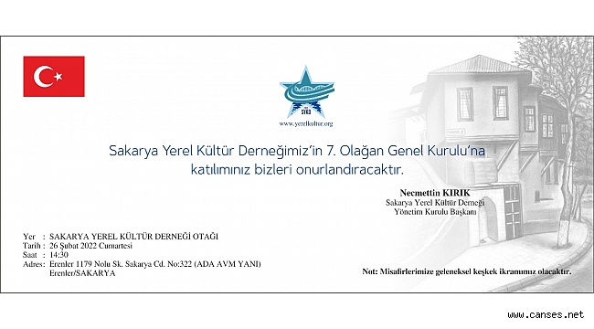 Sakarya Yerel Kültür Derneği’nin 7. Olağan Genel Kurulu 26 Şubat 2022 Cumartesi günü Saat 14.30’da derneğin Erenler’deki Otağında yapılacak.