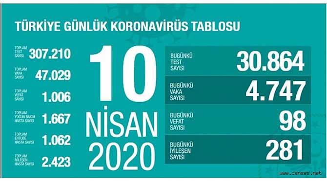 Türkiye'de corona virüsü salgınında son 24 saatteki yeni vaka sayısı 4 bin 747 olurken yaşanan can kaybı ise 98 oldu. Toplamda iyileşen hasta sayısı ise 2 bin 324 olarak açıklandı. Türkiye'deki toplam can kaybı 1.006 olurken toplam vaka ise 47.029 oldu.