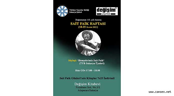 TYB Sakarya Şubesi ile Değişim Kitabevi, hemşehrimiz yazar Sait Faik'in 115. doğum yılı nedeniyle bir hafta sürecek bir edebiyat etkinliği düzenledi. Ünlü yazarın doğumunun yıldönümü olan 18 Kasımda başlayacak ve bir hafta sürecek etkinlikte her gün saat 17.00-18.00 arası TYB üyesi bir yazar Sait Faik üzerine Değişim Kitabevi'nde bir söyleşi gerçekleştirecek. Değişim Kitabevi de hafta boyunca Sait Faik'in anısına, yazarın kitaplarını yüzde 25 indirimli satacak.