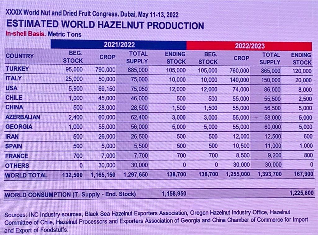 Bu tablo tahmini bir tablo ancak realite şu ki daha düne kadar bizim üretimimiz yanında esamesi okunmayan ülkeler üretimini her geçen gün artırmakta. Örnek vermek gerekirse Şili Ticaret Ateşeliğinden aldığımız bilgiye göre 2027 Yılında Şili üretimini 127 Bin Tonlara çıkarmayı hedefliyor. 2022 tahmini görüyorsunuz 55 Bin Tonlarda. Bu hızlı artış ancak şöyle izah edilebilir. Türkiye fındık üretimi aleyhine bir çalışma hızla devam ediyor. Biz buna hazırlıklı mıyız?, biz neler yapıyoruz? Bu konuda herhangi bir aksiyon alındığı hususunda bir hedef, plan yok biliyoruz. Özellikle fındık açısından terk edilmiş bölge olan Ordu, Giresun ve Trabzon illeri için acil durum çağrısı yapıyoruz. Bu bölgenin ekonomisi fındık olmadan olmaz. Bu bölge fındık ve ülke için stratejik öneme sahip. Hal böyle olunca buradaki insanlarımızın tarımsal faaliyetlerini devam ettirebilmesi için kesinlikle ve kesinlikle devlet desteği ile bu arazilerin makinalı tarıma geçişi sağlanmalı, arazilerin toplulaştırılması sağlanmalı, çiftlik yönetimi şekli işletmelere dönüştürülmesi lazım gelmekte. Bunun için üniversitemizin ve sektörün işbirliği yaparak belirli bir planlama dahilinde bu üç ilimizdeki arazilerin planlı üretime geçirilmesi gerekmekte.