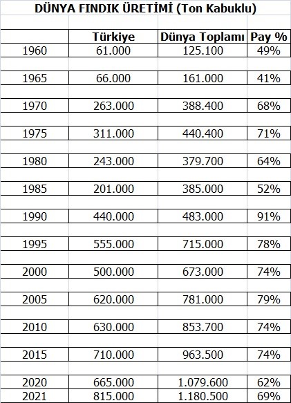 Sn. Bakanım, ben fındıkta en büyük sorunun ÜRETİM olduğunu dünüyorum. Neden düşünüyorum derseniz, Size aşağıda sunacağım tablo göstermektedir ki Türkiye Fındık tarımında her ne kadar üretim sahalarını Ova diye tabir ettiğimiz alanlarda çoğaltsa bile Dünya’daki ağırlıklı liderliğini gittikçe kaybetmektedir. Bu uzun yıllara sari bizim aleyhimize bir durum oluşturacaktır.