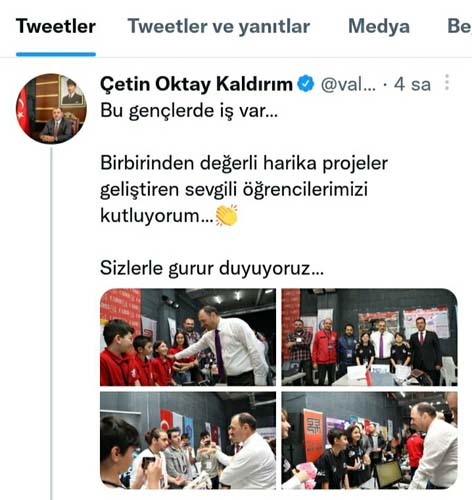 Bugün yaptığı bir paylaşımında “Bu gençlerde iş var… Birbirinden değerli harika projeler geliştiren sevgili öğrencilerimizi kutluyorum. Sizlerle gurur duyuyoruz…” ifadelerini kullanan Valimiz Çetin Oktay Kaldırım, bu yıl Sakarya olarak katılım rekoru kırdığımız Teknofest Karadeniz 2022 Festivalinde emeği geçen başta İl Millî Eğitim Müdürü Ebubekir Sıddık Savaşçı olmak üzere, tüm okul müdürlerini, danışman öğretmenlerini, öğrencilerimizi ve emeği geçen herkesi ayrı ayrı tebrik etti.