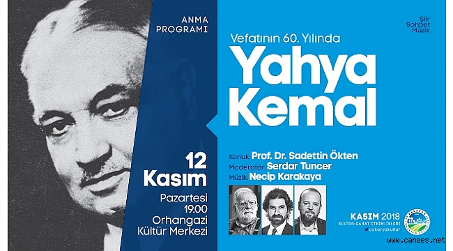 Sakarya Büyükşehir Belediyesi Kasım Kültür Sanat Etkinlikleri Yahya Kemal’in vefatının 60. yıldönümü dolayısıyla düzenlenecek anma programıyla devam edecek. Şiir, sohbet ve müziğin bir arada olacağı programda Prof. Dr. Sadettin Ökten Yahya Kemal’i anlatacak. Moderatörlüğünü Şair Serdar Tuncer’in üstleneceği programda Necip Karakaya müzik dinletisi sunacak. Kültür ve Sosyal İşler Dairesi Başkanlığı’ndan yapılan açıklamada, “12 Kasım Pazartesi günü saat 19.00’da Orhangazi Kültür Merkezi’nde şiirin, sohbetin ve müziğin bir arada olacağı programımıza tüm kültür sanat dostları davetlidir” ifadelerine yer verildi.