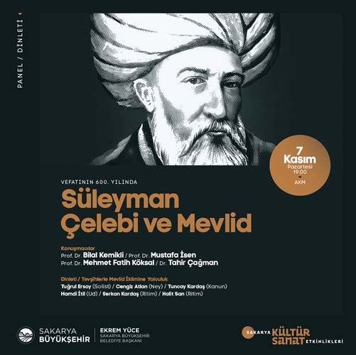 Sakarya Büyükşehir Belediyesi Kasım kültür sanat etkinlikleri ‘Vefatının 600. Yılında Süleyman Çelebi ve Mevlid’ adlı panel ve dinleti ile devam edecek. 7 Kasım Pazartesi günü AKM’de gerçekleştirilecek olan program saat 19.00’da başlayacak. Prof. Dr. Bilal Kemikli, Prof. Dr. Mustafa İsen, Prof. Dr. Mehmet Fatih Köksal ve Dr. Tahir Çağman’ın konuşmacı olarak katılacağı programda Teşvihlerle Mevlid İklimine Yolculuk isimli dinleti de gerçekleştirilecek. Solist Tuğrul Ersoy ile orkestrası sahne alacak. Kültür ve Sosyal İşler Dairesi Başkanlığı’ndan yapılan açıklamada, Vefatının 600. Yılında Süleyman Çelebi ve Mevlid isimli panel ile gerçekleştirilecek dinleti etkinliğine tüm kültür sanat dostlarının davetli olduğu ifade edildi.